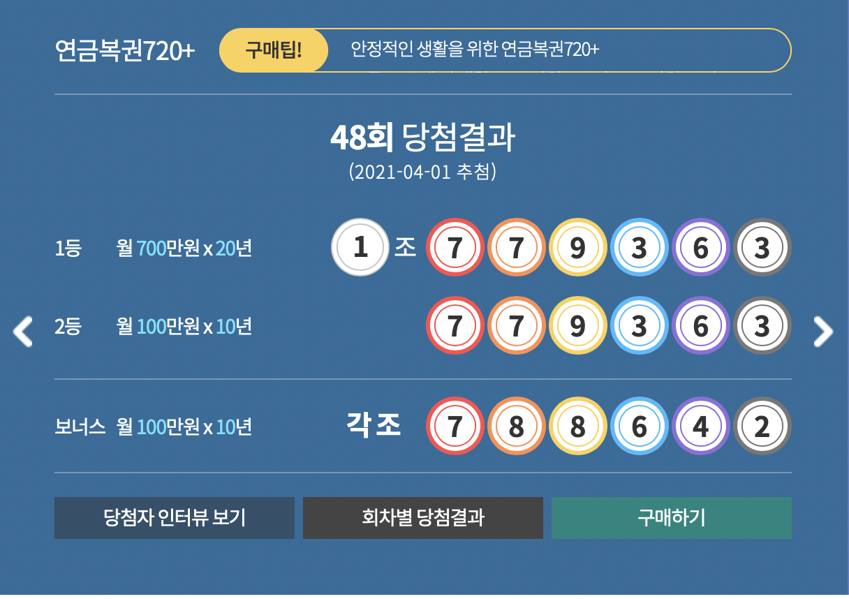 따라서 해당 번호구조가 되도록 동행복권 홈페이지에서 구매를 하신다면 더 좋은 결과가 있지 않을까 생각해봅니다.