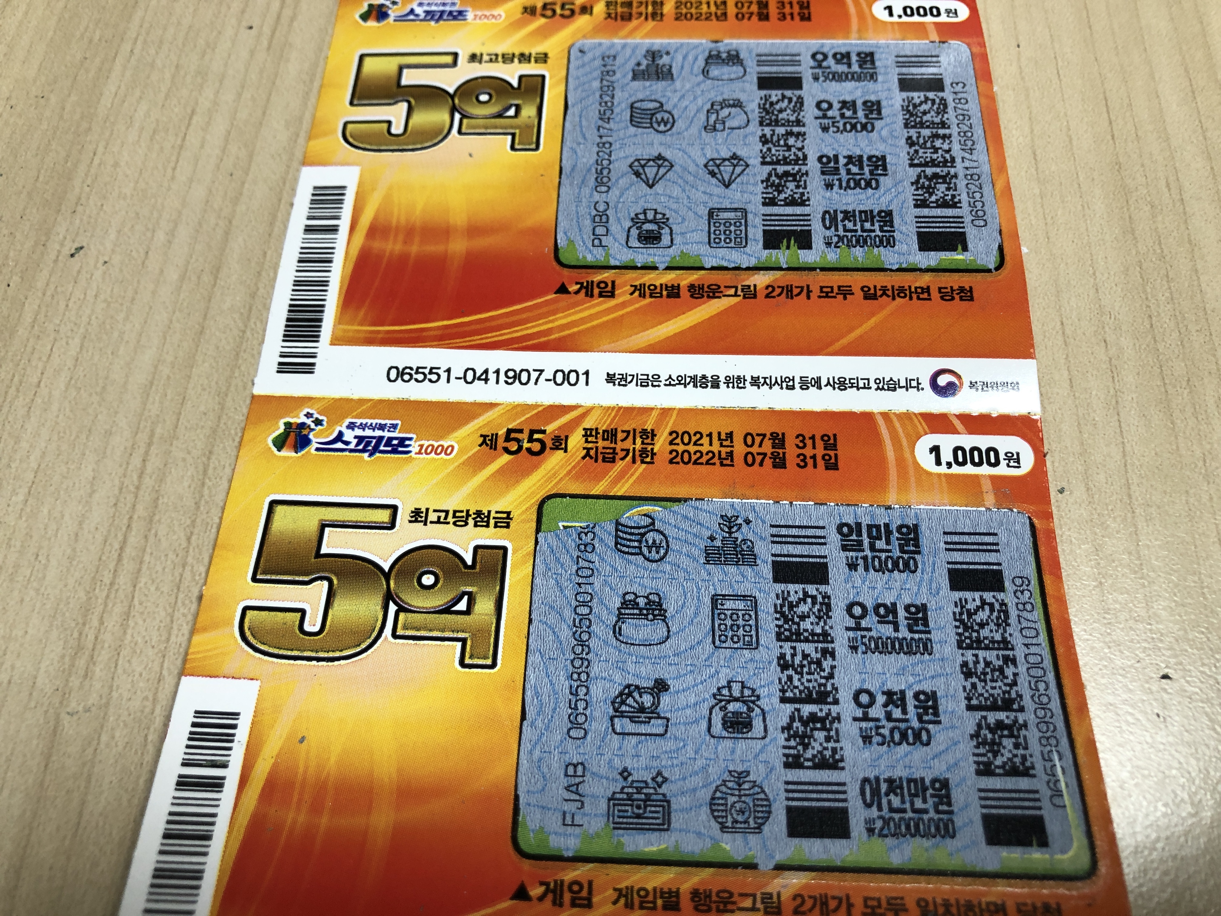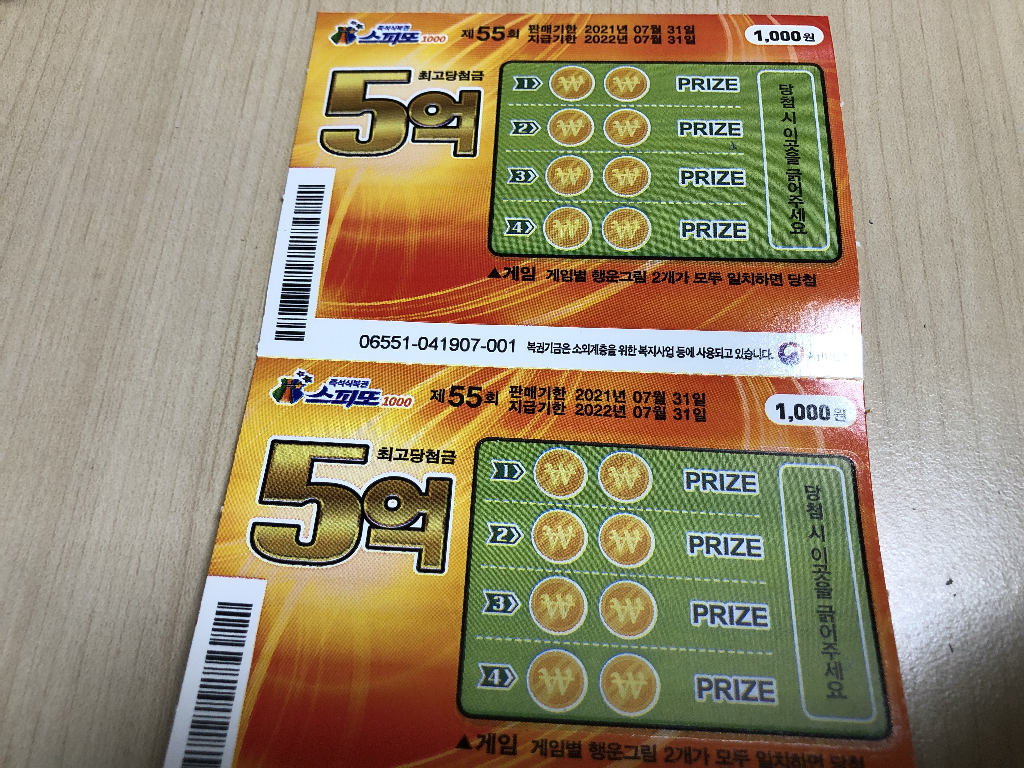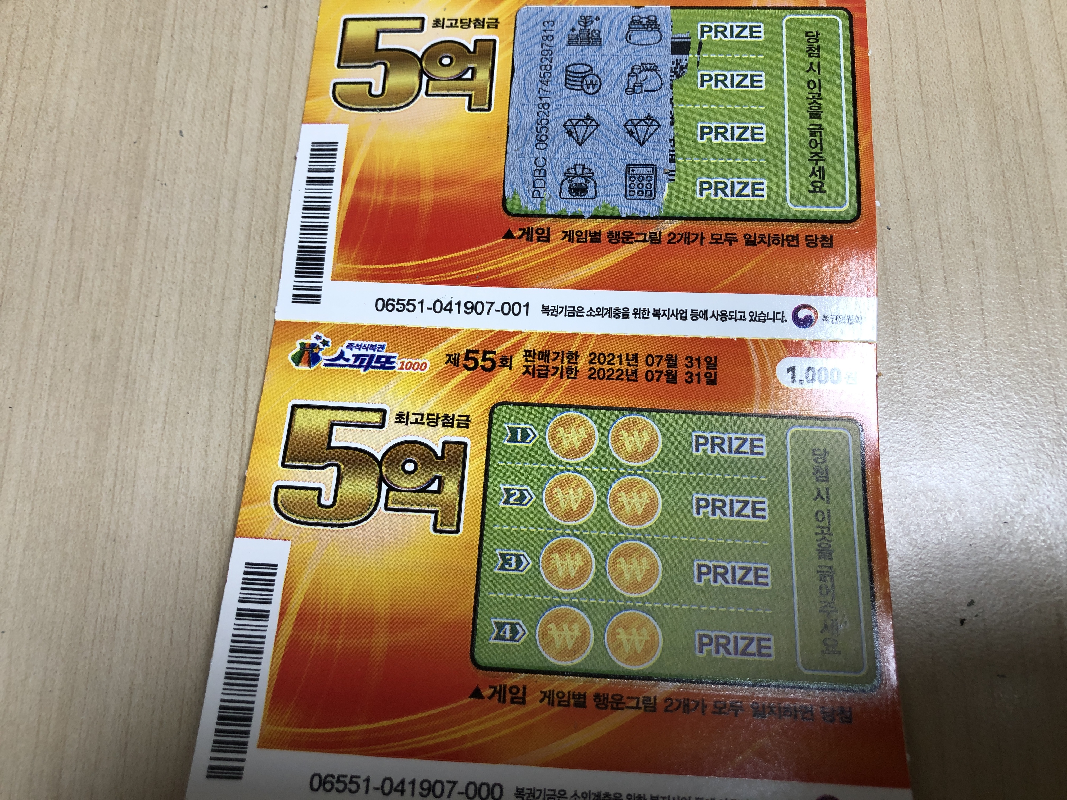 스피또 1000 제 55회 4장을 연달아 구매했고 1등 당첨금액은 5억 2장, 총 10억입니다.