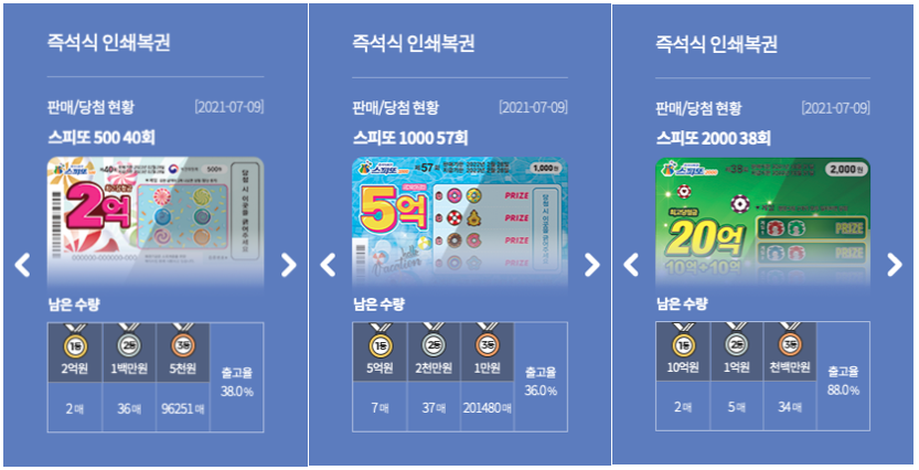 1등 10억원이 2장 남아있으니 스피또 2000을 구매해보시는것도 좋을거 같네요.