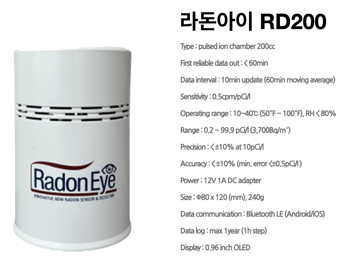 이번에 공기중 라돈을 측정하기 위해서 사용된 장비는 라돈아이 RD200 제품으로 시중에서 약 199,000원에 판매가 현재 되고 있는 제품입니다. 과거 이 라돈 측정기를 만든 회사가 라텍스 라돈 침대로 인해 꽤 많은 돈을 벌었다고 했습니다.